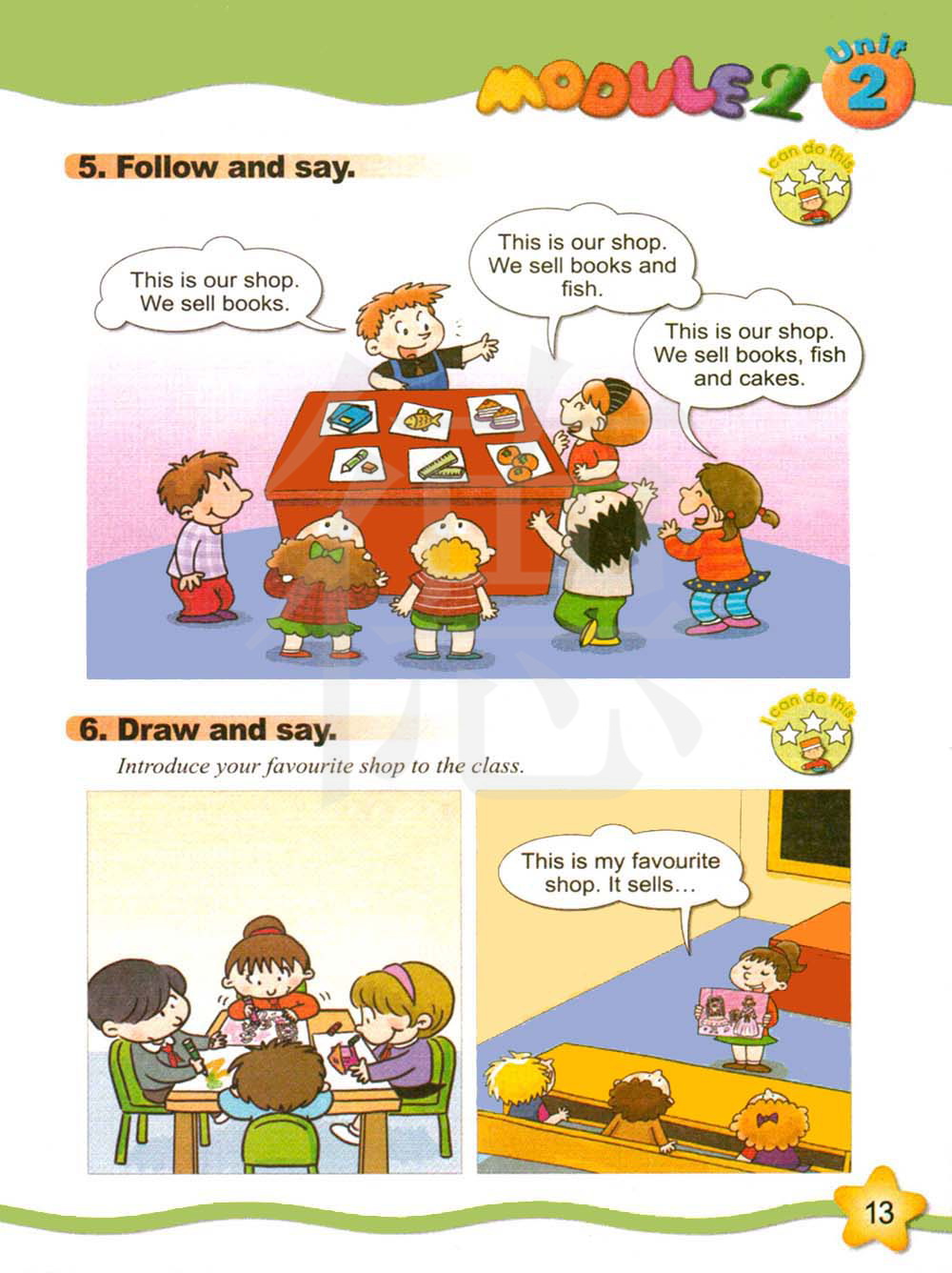 这是我们的商店。我们卖书,鱼和蛋糕。