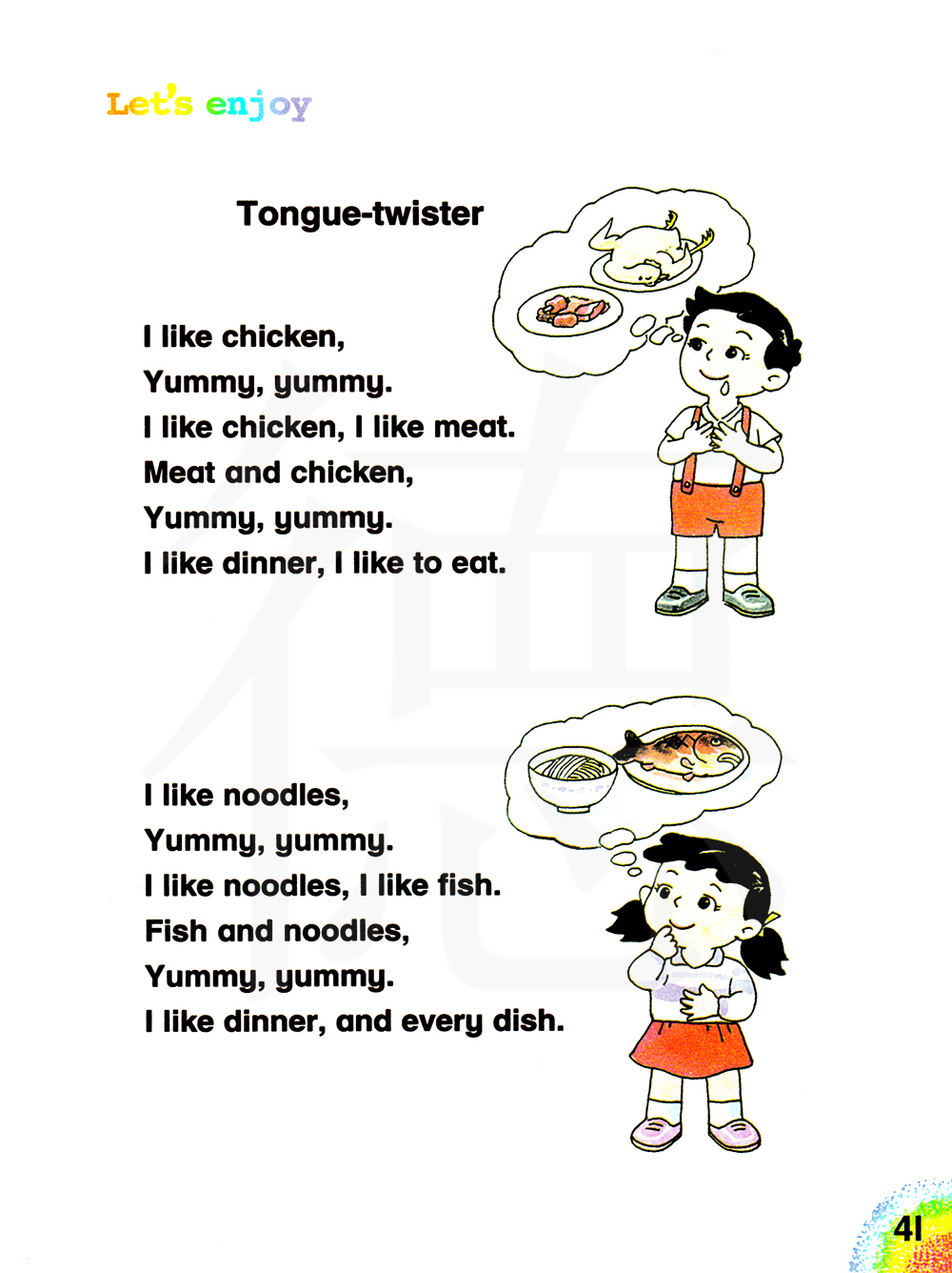 我喜欢鸡肉, 好吃,好吃。 我喜欢鸡肉,我喜欢肉。 肉和鸡肉,好吃,好吃。 我喜欢晚餐,我喜欢吃