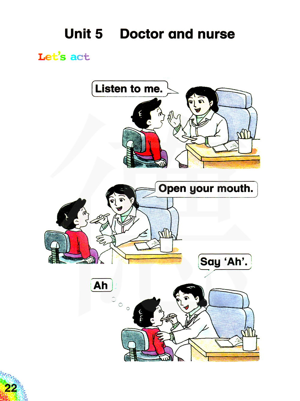 3. 通过模仿医生看病的片断,使学生了解医护工作的职业特点和一些必要的看病常识,培养学生热情待人、关心他人的情感意识。