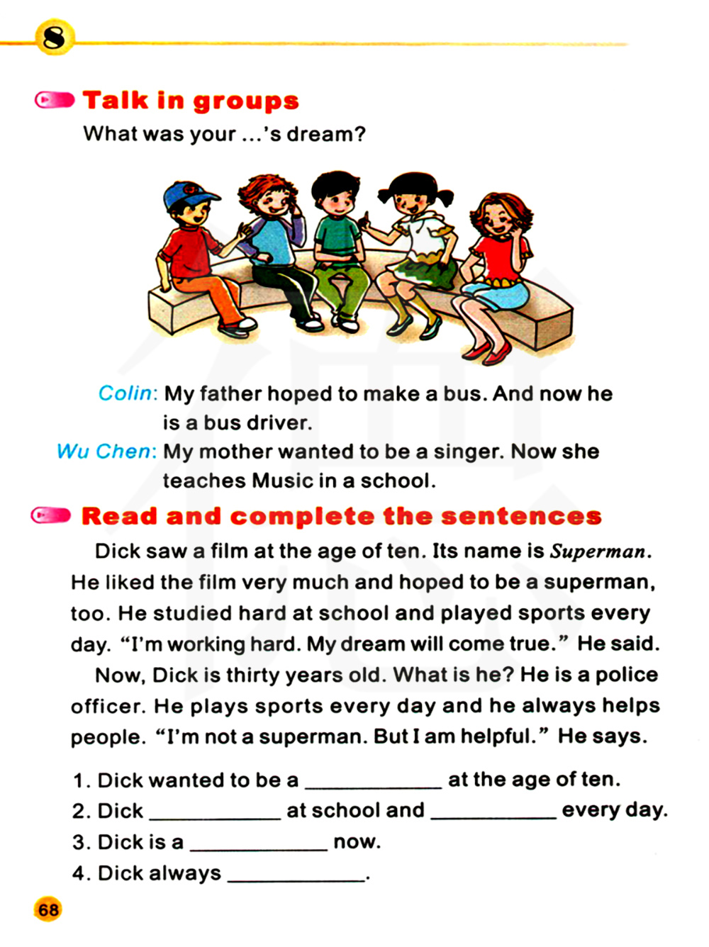 现在,迪克三十岁了。他是做什么的?他是一位警察。他每天参加运动并总是帮助他人。我不是超人。但是我乐于助人。他说。