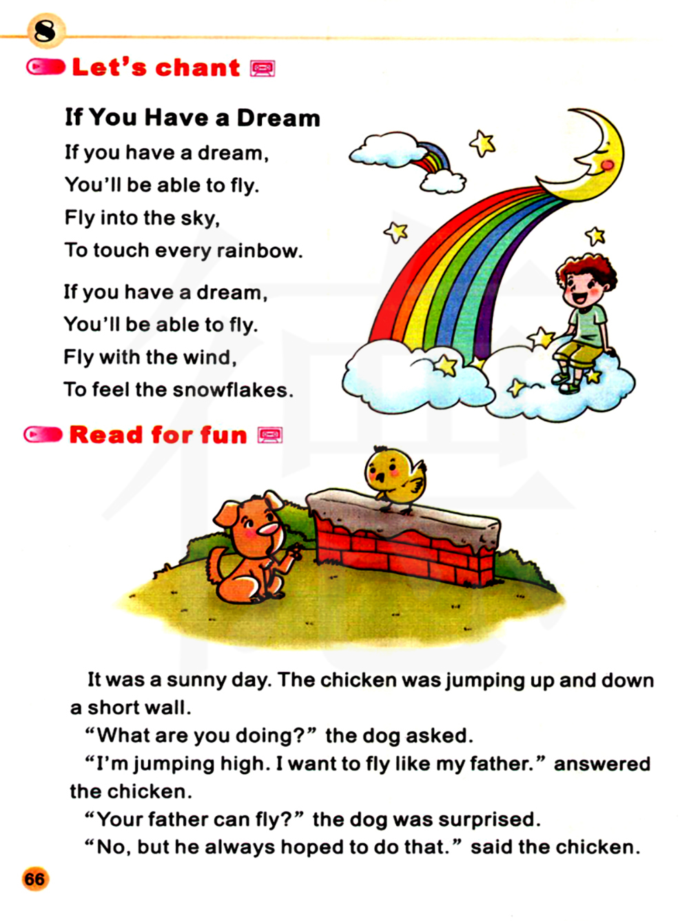 我在跳高。我要像我父亲一样飞。小鸡回答。