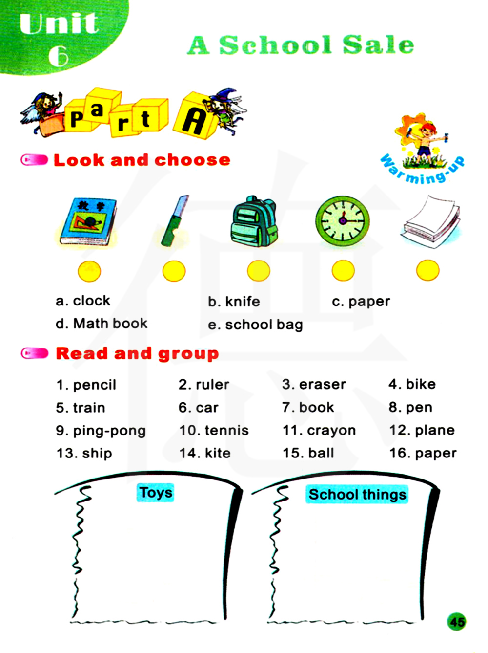 1.能听说读写以下词汇,Notebook, magazine, glue storybook model plane, toy car a pair of scissors