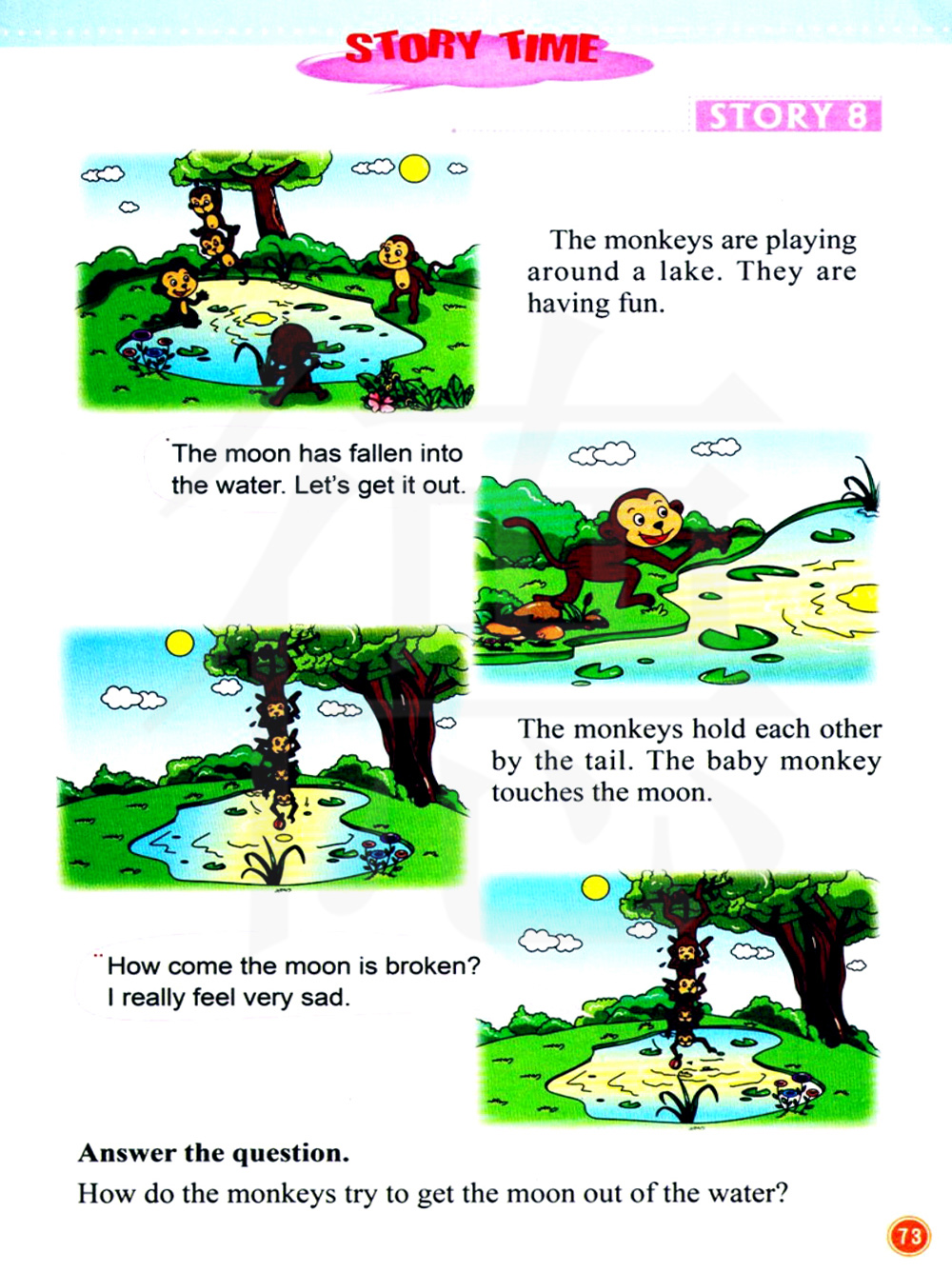 月亮掉进了水中,我们去把月亮捞出来吧。