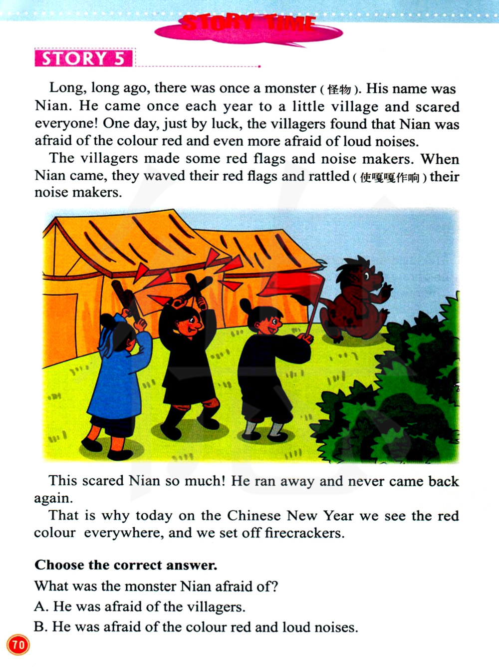 很久很久以前,有一个怪兽。 他的名字叫年。 他每年都到小村庄来一次,每个人都害怕! 一天,很走运地, 村民们发现年害怕红色,更怕噪音。