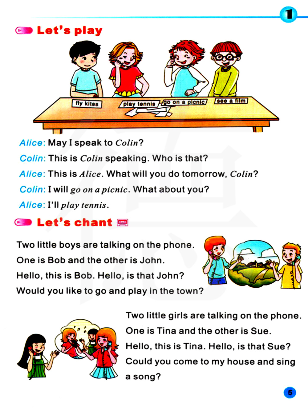 两个小男孩正在打电话。一个是鲍勃,另一个是约翰。你好,我是鲍勃。你好,你是约翰吗?你想去城里玩吗?两个小女孩正在打电话。 一个是蒂娜,另一个是苏。你好,我是蒂娜。你好,你是苏吗?你能到我家来唱歌吗?
