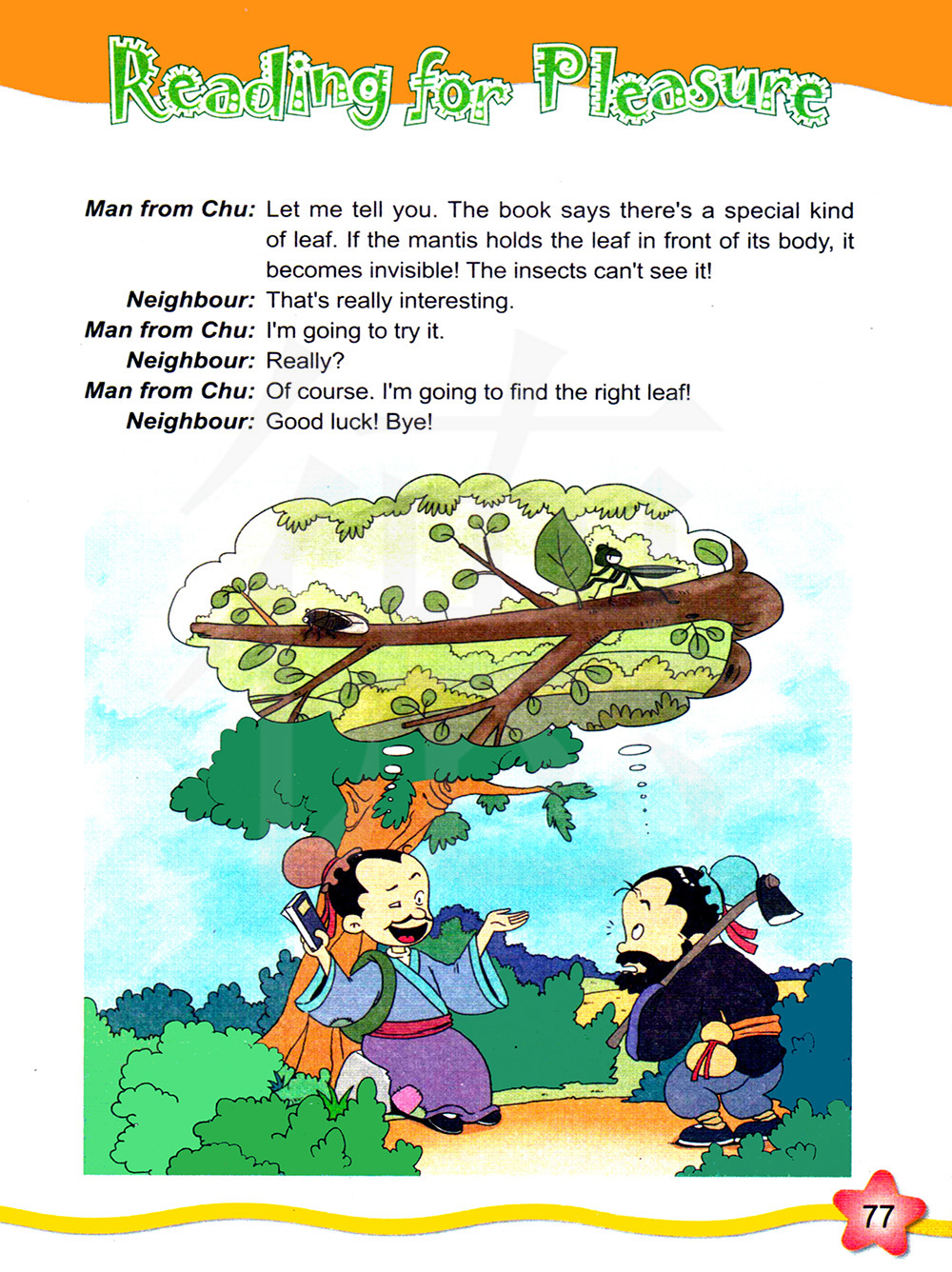 我来告诉你吧。这本书说有一种特殊的叶子。如果螳螂把这种叶子放在它身体的前面,它就会不被看见。(小)昆虫就看不到它!