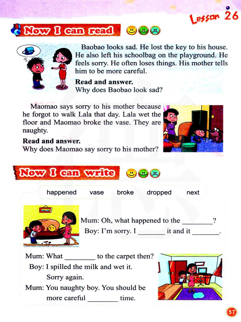 毛毛对妈妈说对不起,因为他那天忘了遛拉拉。 拉拉把地板弄湿了,毛毛打碎了花瓶.他们都很淘气。