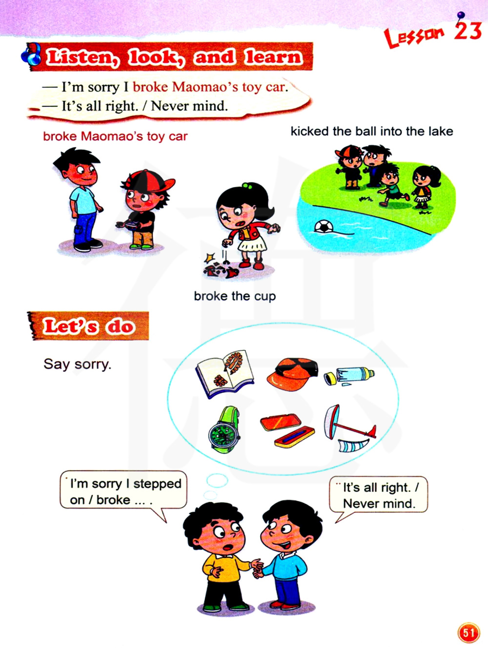 我很抱歉弄坏了毛毛的玩具汽车。没关系。/别担心。
