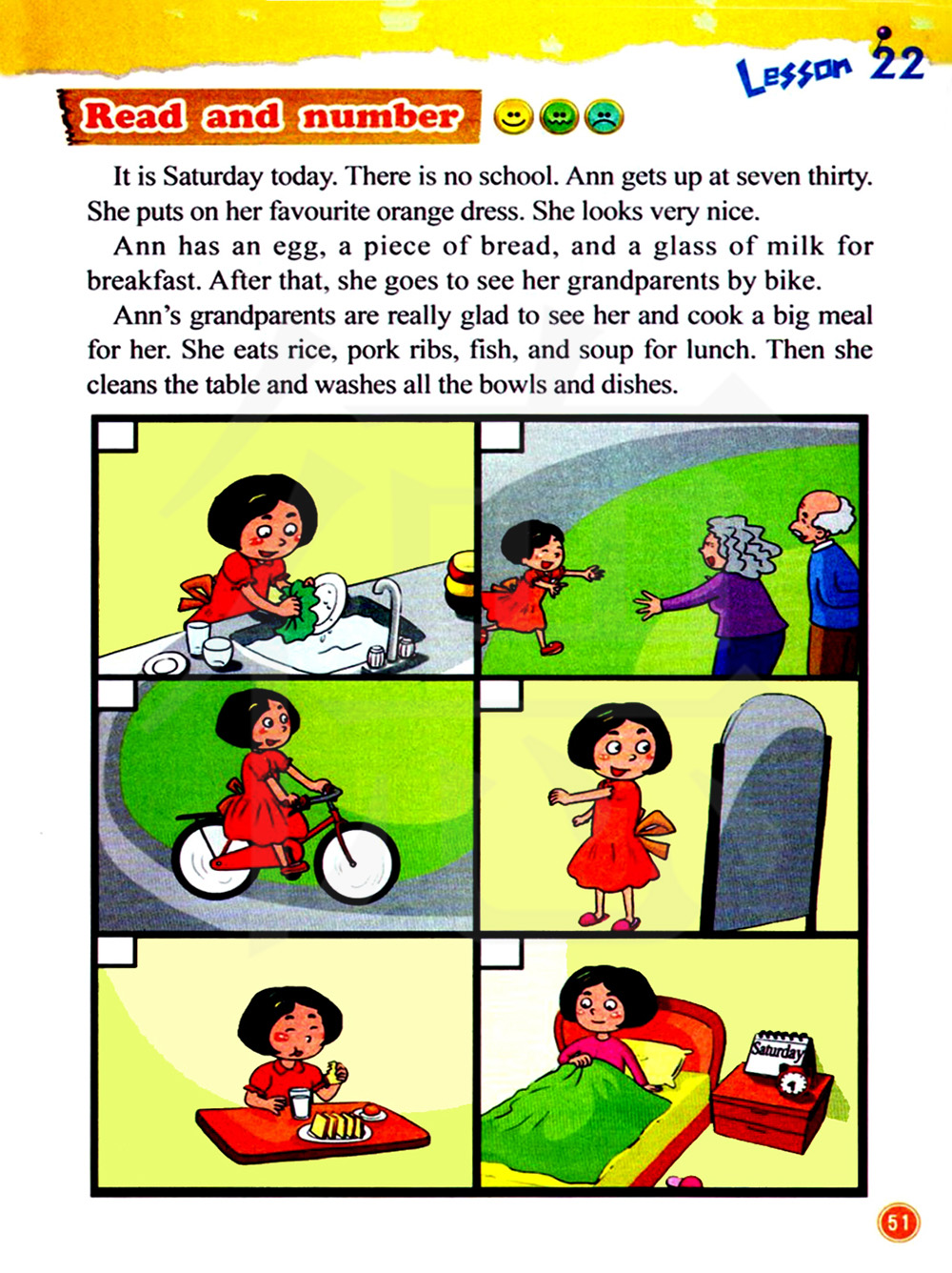 今天是星期六。不用上学。安七点三十分起床。她穿上她最喜欢的橙色裙子。她看起来非常漂亮。