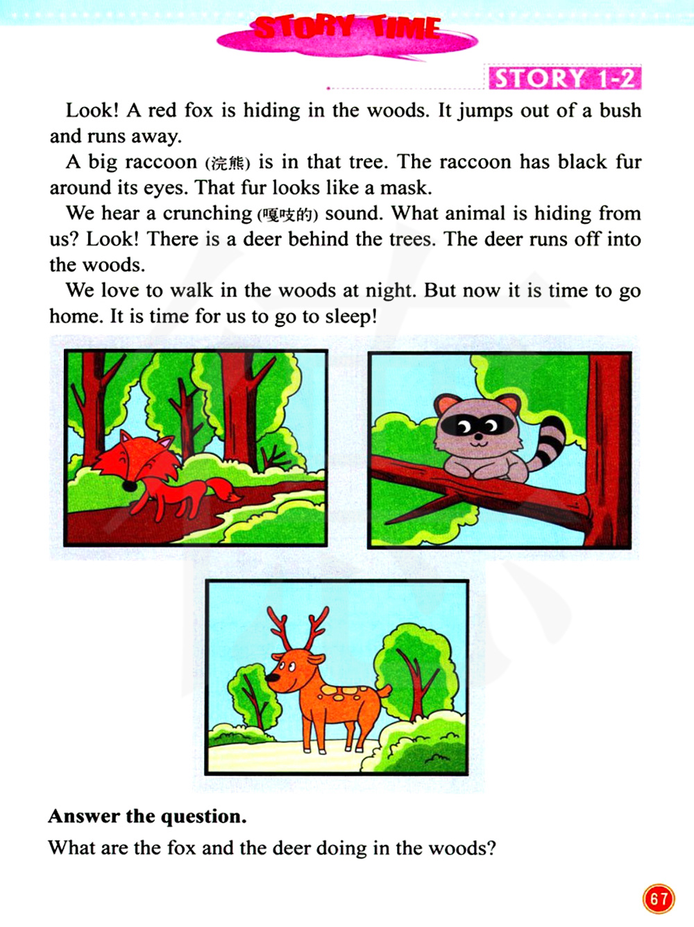 看!一只红狐狸躲在树林里。它跳出灌木丛跑掉了。一只大浣熊在那棵树上。浣熊的眼睛四周有黑色的毛。 那毛看起来像一个面具。