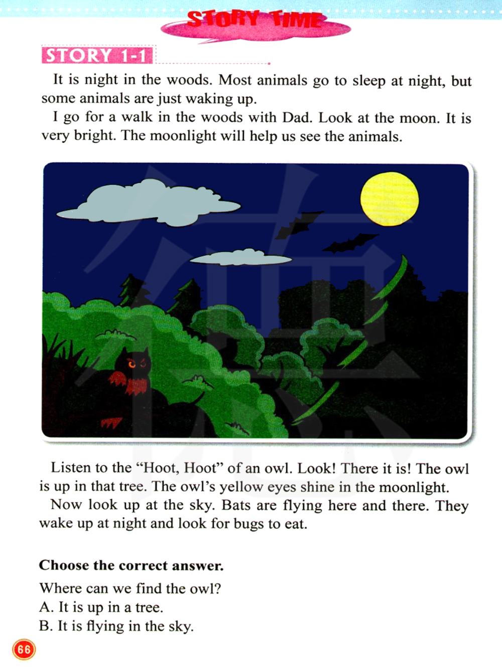 听到猫头鹰发出的呜,呜声。看!它在这儿!猫头鹰在那棵树上。猫头鹰的黄眼睛在月光下烁烁放光。