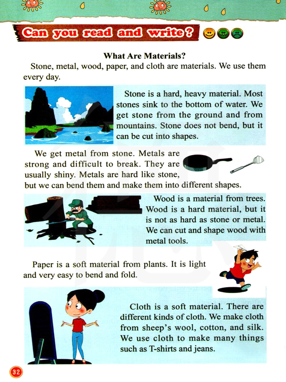 石头、金属、木材、纸和布都是材料。 我们每天都会用到它们。