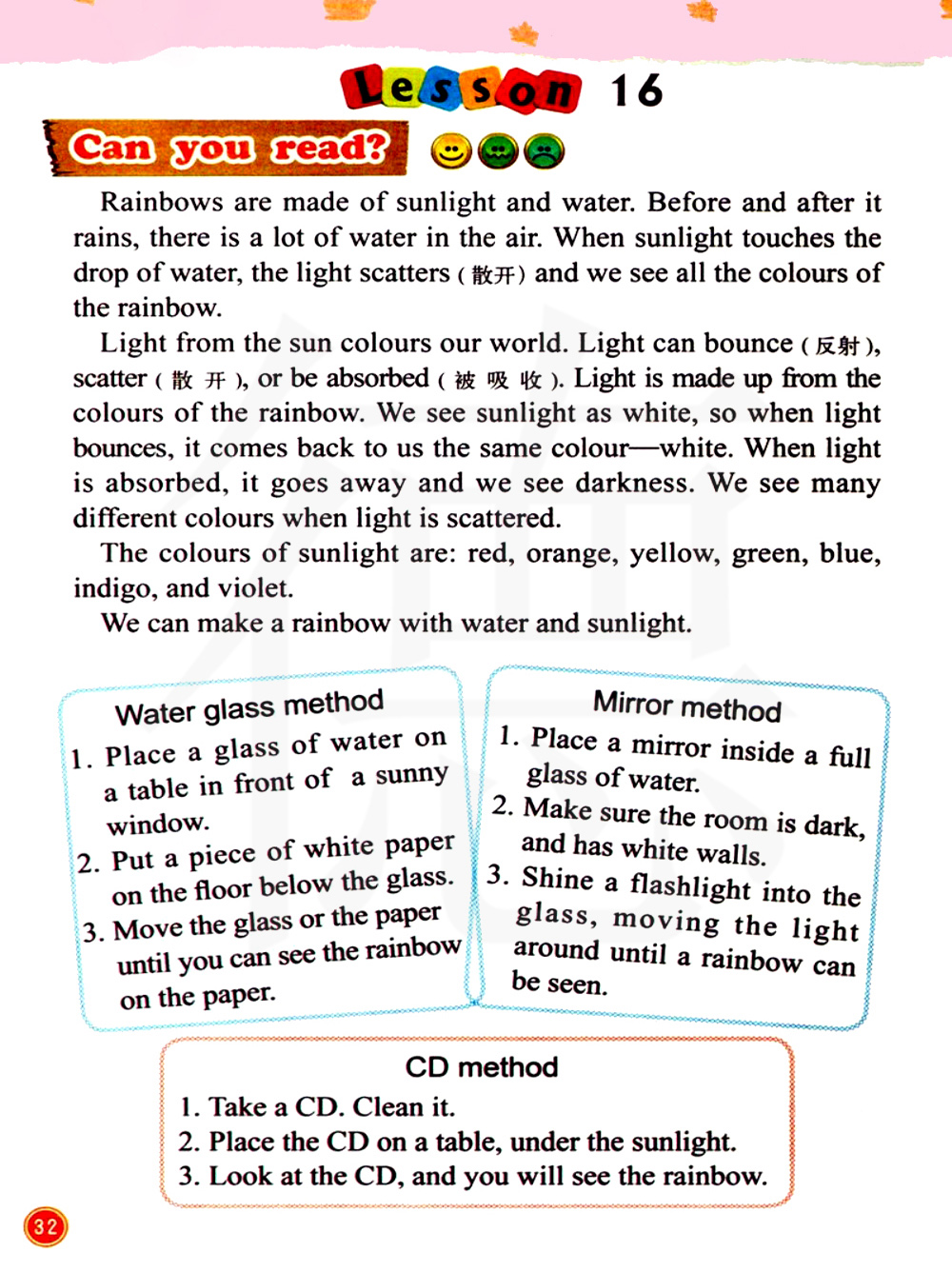 来自太阳的光线让我们的世界色彩丰富。光线可以反射、散开或被吸收。光由彩虹的色彩组成。我们看见光是白色的,所以当光反射时,它返回相同的颜色——白色。 当光被吸收时,它消失了,我们只能看见黑暗。当光散开时,我们看见许多不同的颜色。