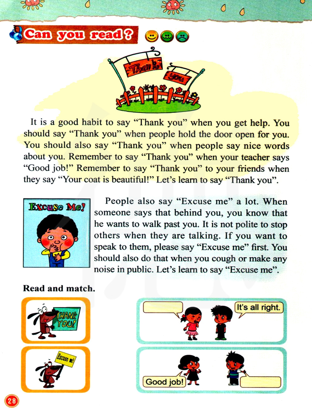 在你得到帮助时,说声谢谢是一个好习惯。 当人们为你开着门时,你应该说谢谢。 当人们对你说好听的话时,你也应该说谢谢。 当老师夸你做得好!时,记得说谢谢。当你的朋友们说你的外套很漂亮时.记得对他们说声“谢谢”。让我们学会说谢谢。