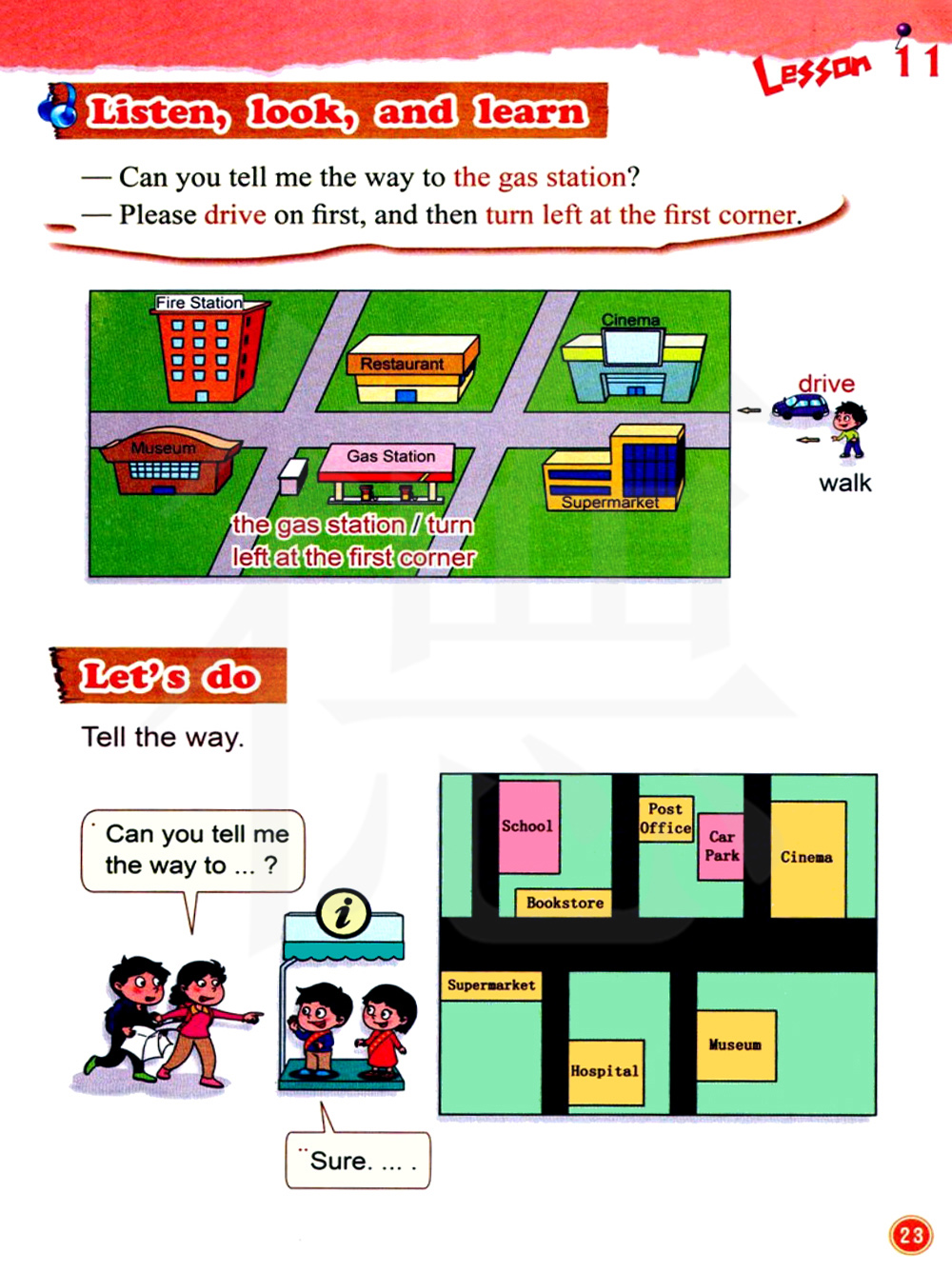 你能告诉我怎么去加油站吗?首先向前开, 然后在第一个路口向左转。