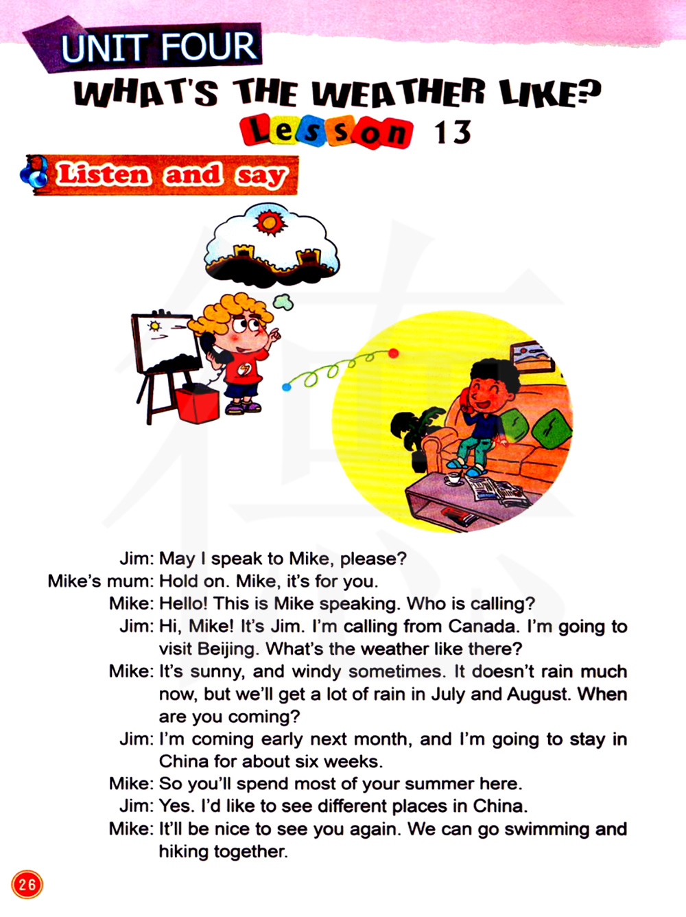 你好!我是迈克。请问是哪位? 嗨,迈克。我是吉姆。我从加拿大给你打电话。 我马上要去北京参观。那儿的天气怎么样?