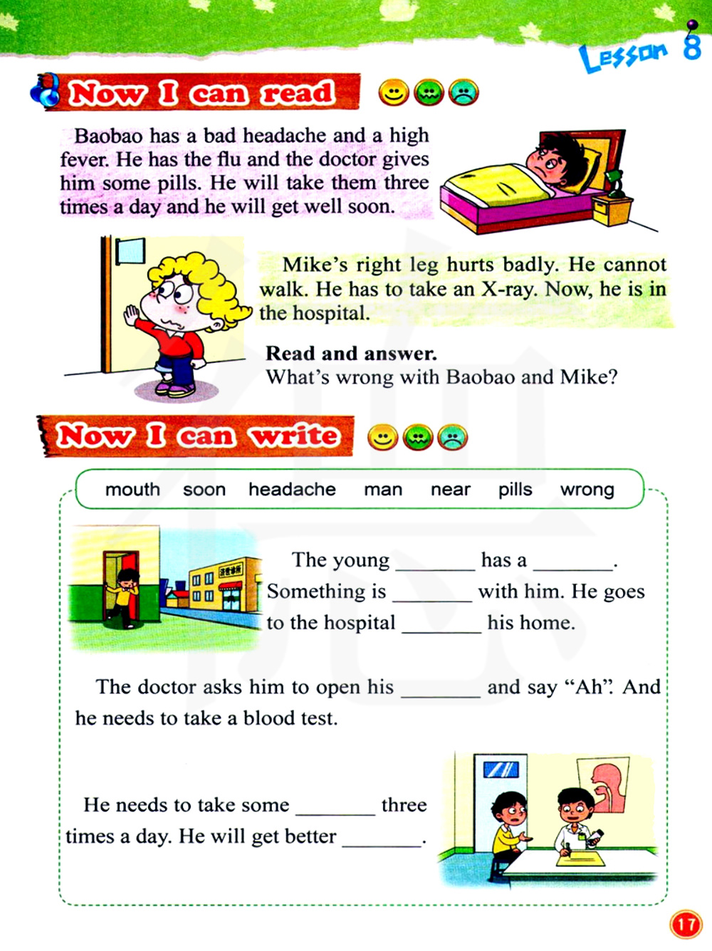 宝宝头很疼,并发高烧。 他得了流感,医生给开了一些药。 他一天要服用三次,很快他就会好了。