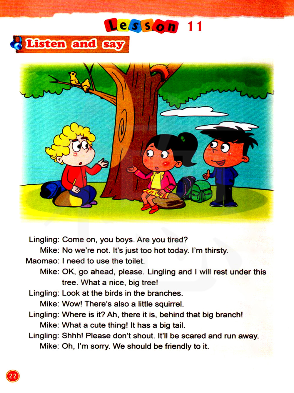 我需要上厕所。 好的,去吧。我和玲玲在这棵树下休息。 多大多好的树啊!