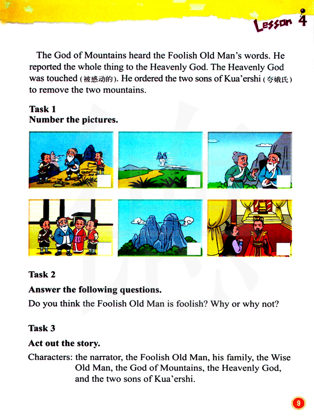 角色:解说员,愚公 ,他的家人,智者,山神,天帝,夸娥氏的两个儿子。