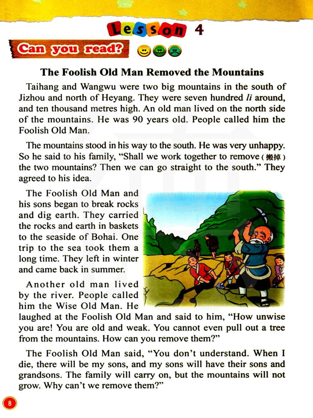 另一位老人住在河边。人们叫他智者。他嘲笑愚公,并对他说:“你真是不聪明啊!年龄老迈,体力又弱。.你连山上的一棵树都拉不动。 又怎么能铲平这座山呢?”