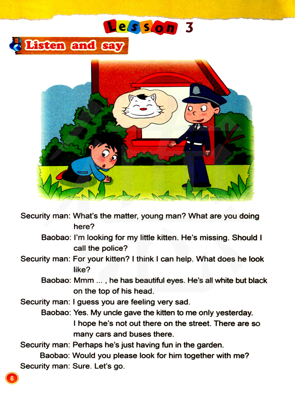 我猜你现在很难过。是的。我的叔叔昨天才把猫送给我。 我希望他不是到马路上去了。那儿的车太多了。