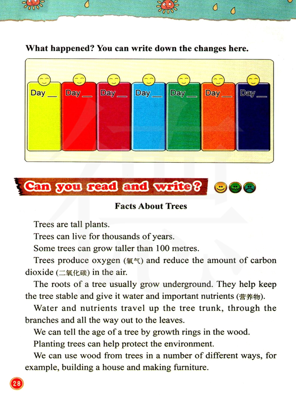 我们可以通过木材中的年轮知道树的年龄。种植树木有助于保护环境。我们可以以许多不同的方式来使用木材, 例如:盖房子或做家具。