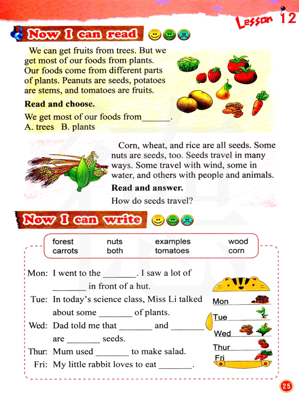 我们能够从树木那里得到果实。但是我们从植物, 不同的部位获得大部分的食物。花生是种子、土豆是茎、西红柿是果实。