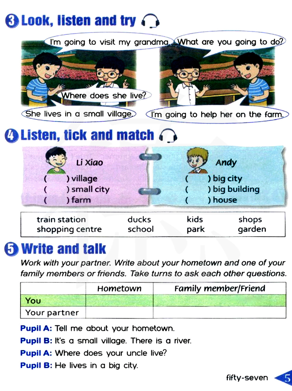 和你的伙伴一起合作。写一写你的家乡和一个家人或朋友