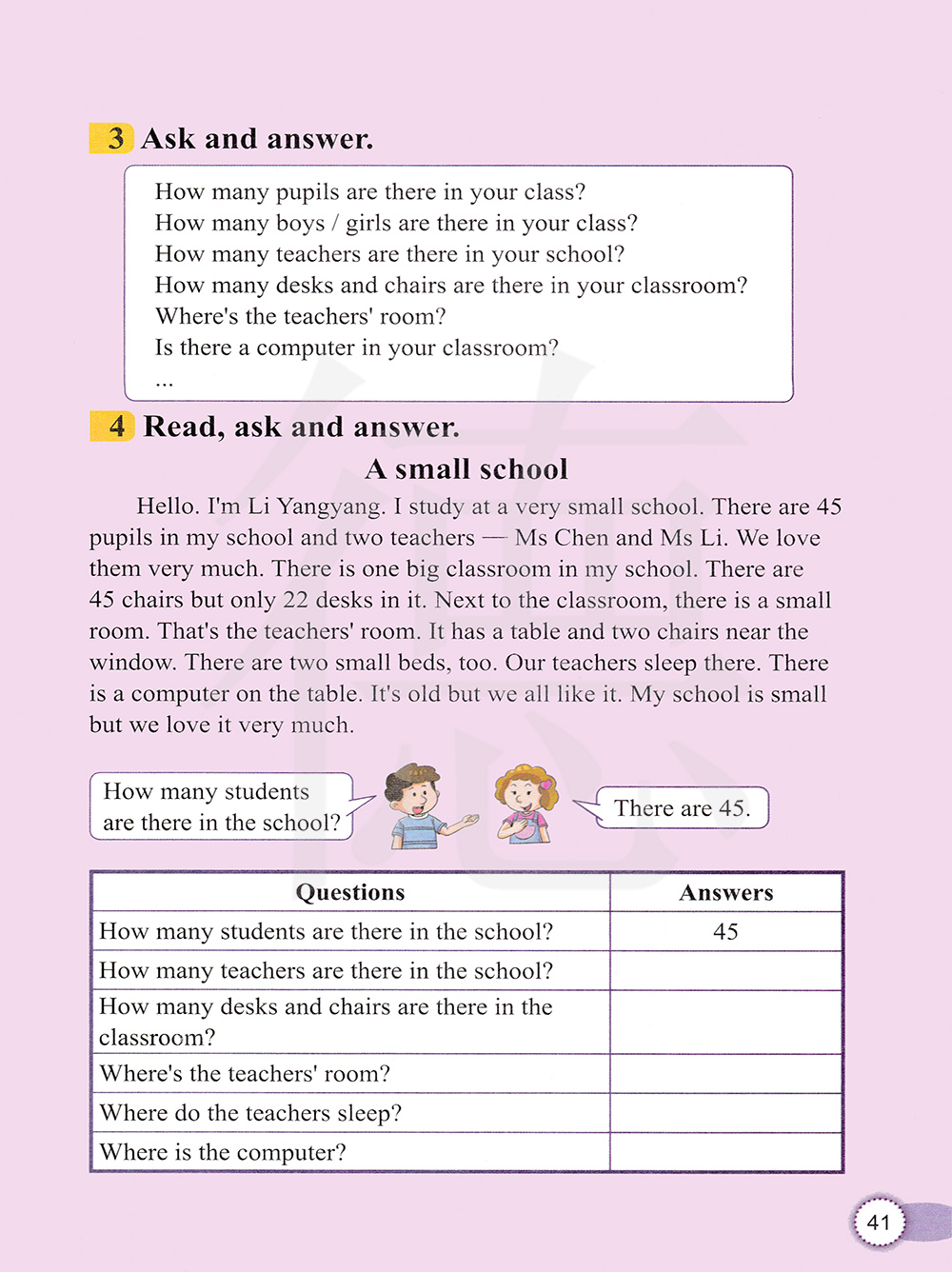 你好。我叫李洋洋。我在一个非常小的学校读书。我们学校有45个学生,还有两个老师—陈老师和李老师。我们都很喜欢他们。学校里有一间大大的教室。教室里有45把椅子,但只有22张课桌。 教室旁边是一个小房间。那是老师的办公室。房间里靠窗的位置有一张桌子和两把椅子。房里还有两个小床。我们老师就睡那里。桌上有一台电脑。电脑有点旧了但我们都很喜欢它。我们学校很小但我们爱我们的学校。