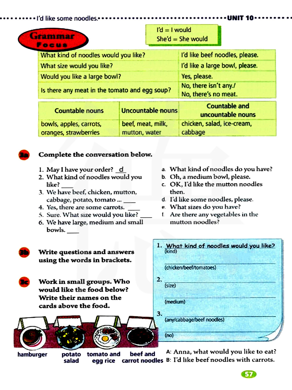 你想要哪种面条?我想要牛肉面,你想要多大份儿的?我想要一份大份的。