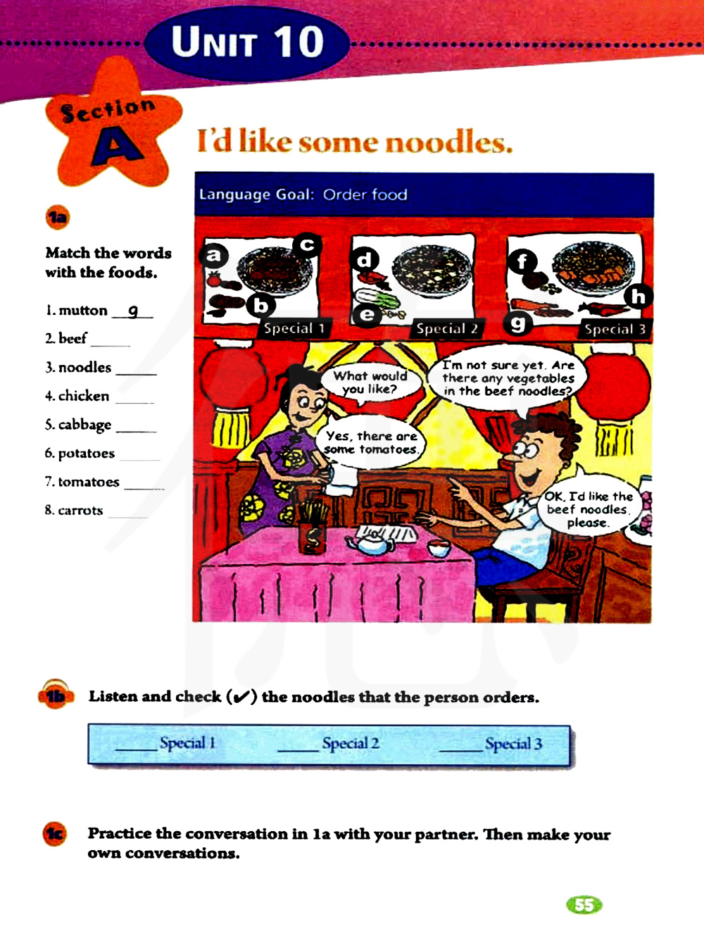 —I’d like beef noodles with carrots. 我想要加胡萝卜的牛肉面。
