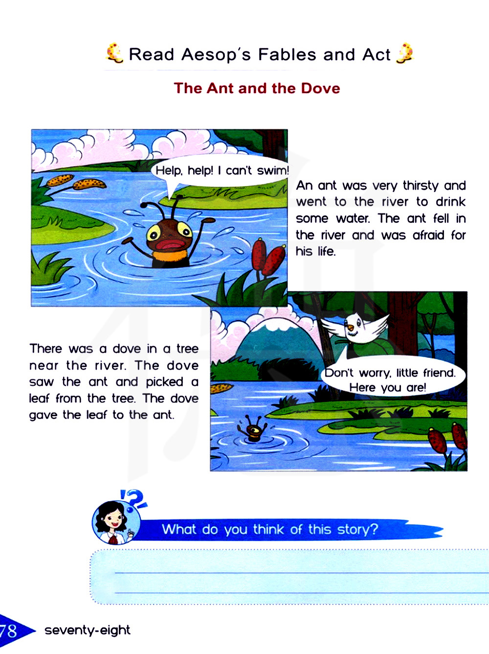 在小河边的树上有一只鸽子。这只鸽子看到了蚂蚁,从树上摘了一片叶子。鸽子把叶子给了蚂蚁