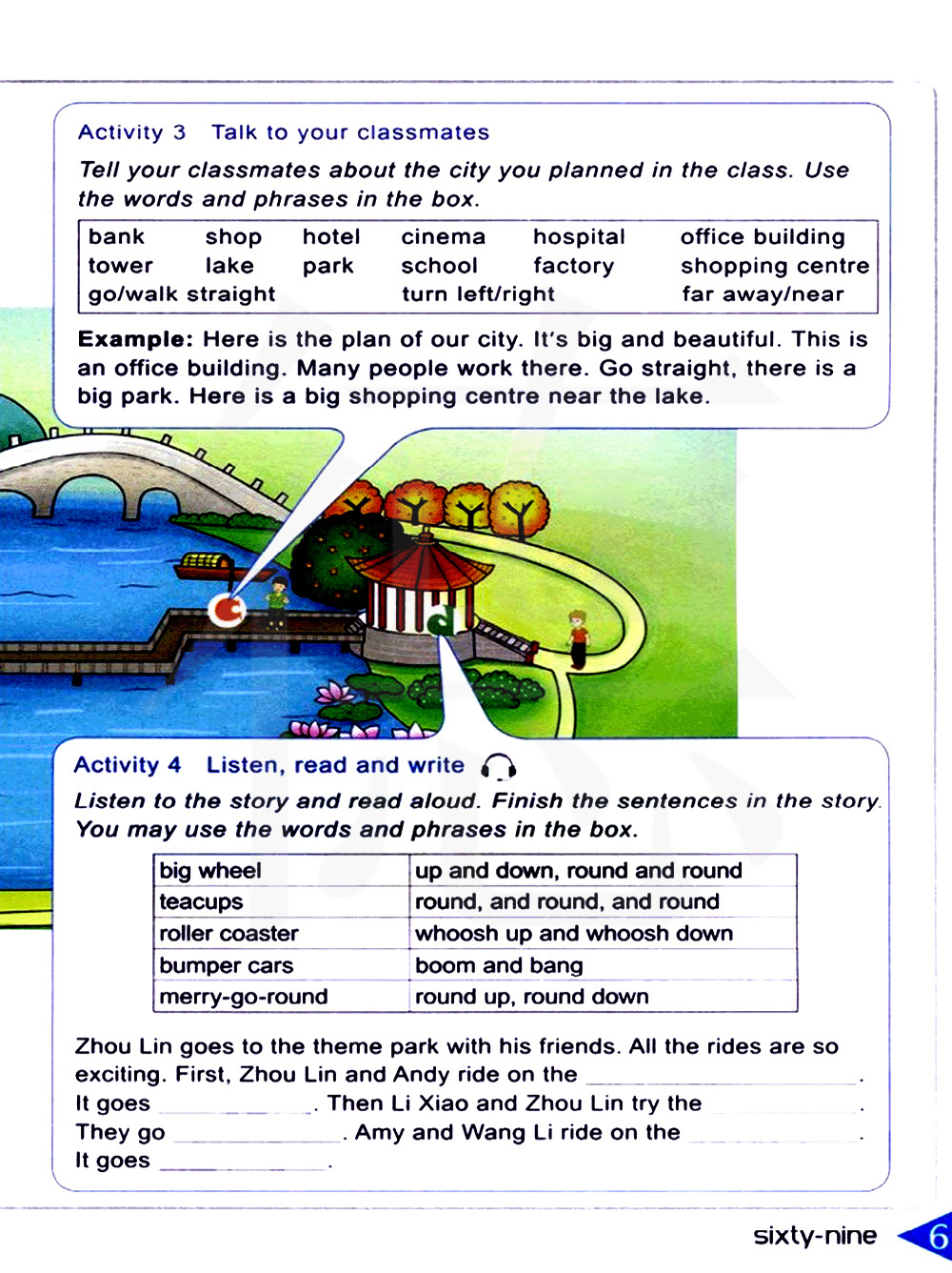 例子:这是我们的城市规划。它又大又美丽。这是一栋办公楼。很多人在这里工作。直走,有一个大公园。在这个湖附近有一个购物中心。
