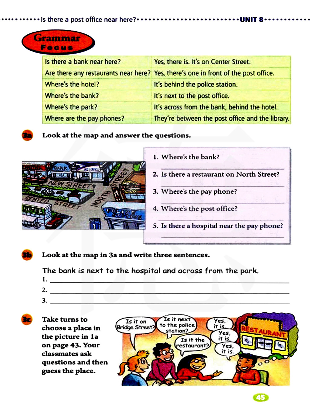 这附近有银行吗?是的,有,它在中心街。这附近有一些饭店吗?有,邮局的前面有一个。旅馆在哪里?在警察局的后面。
