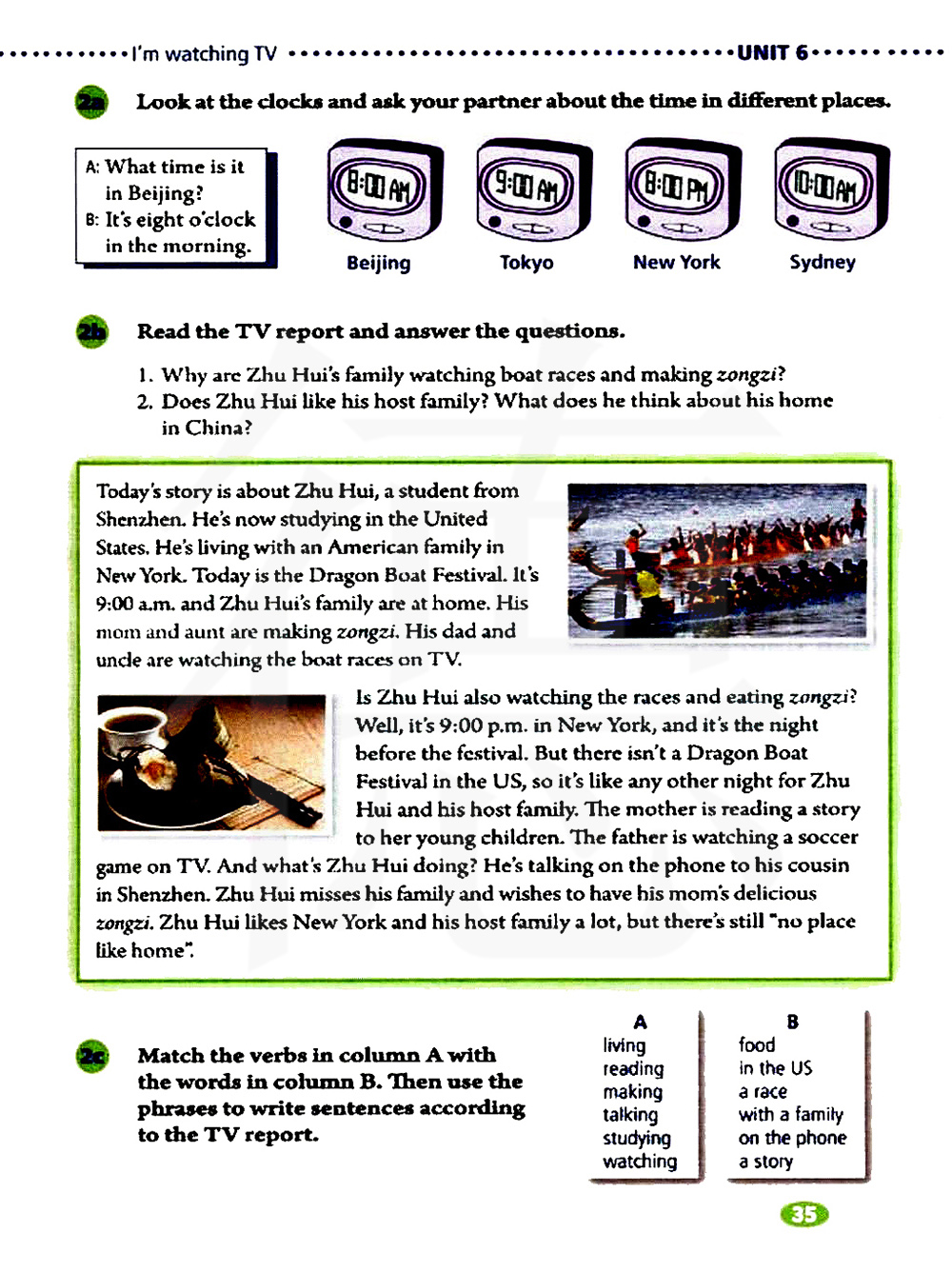 今天的故事关于朱辉的,他是一个来自深圳的学生,他现在在美国学习,他和一家美国人住在纽约,今天是端午节,现在是早上九点。朱辉一家人呆在家里,他的妈妈和阿姨正在包粽子,他的爸爸和叔叔正在看电视上的龙舟赛
