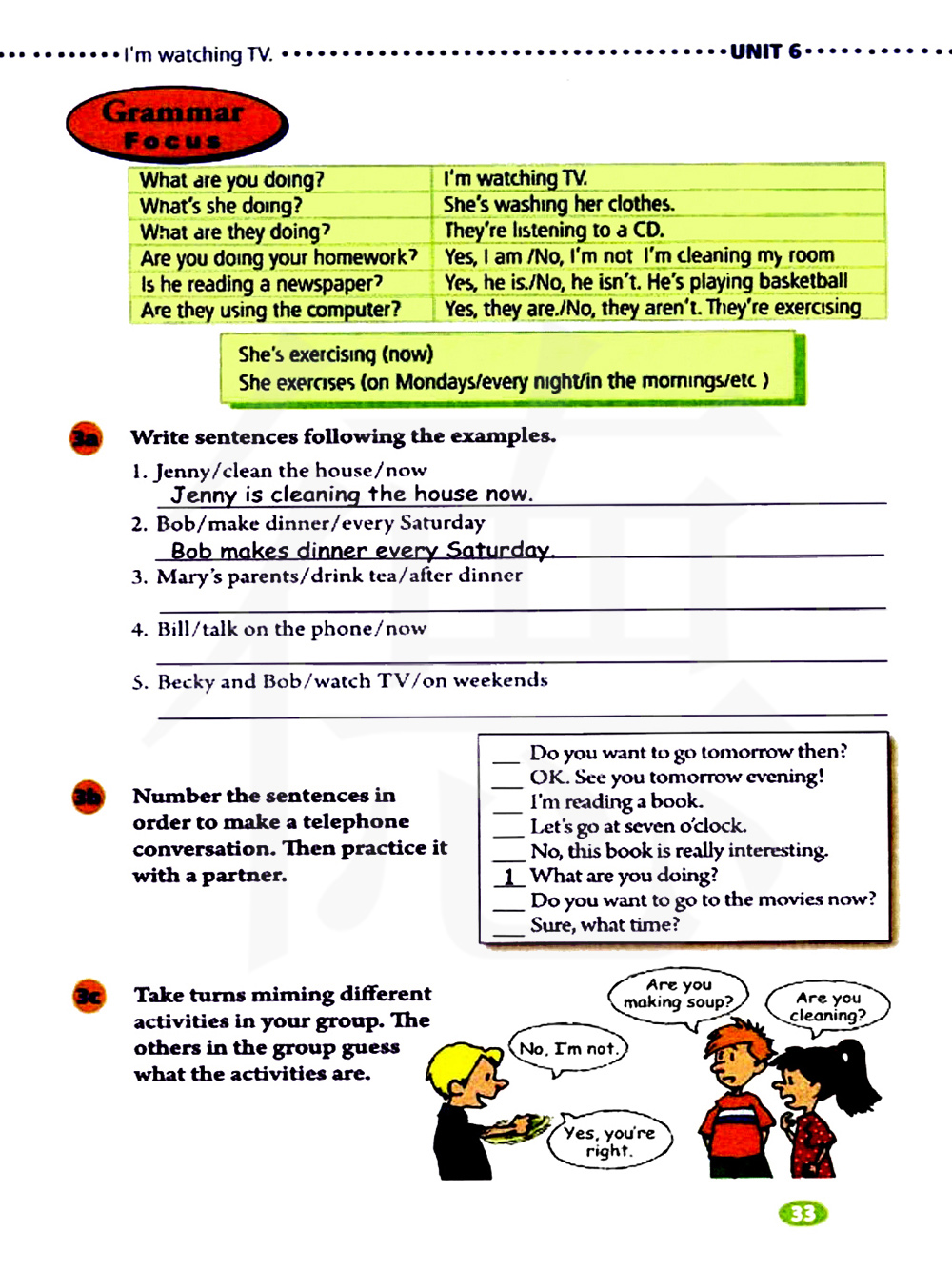 你正在做家庭作业吗?是的,我是。不,我不是,我正在打扫房间。他在读报纸吗?是的,他是,不,他不是,他在打篮球。他们正在使用计算机吗?是的,他们是,不,他们不是,他们正在锻炼身体。