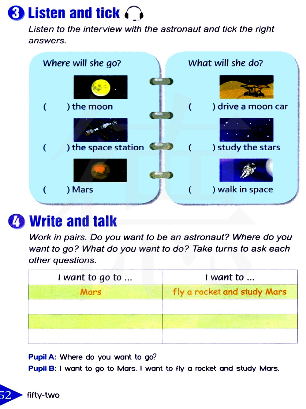 搭档练习。你想做一名宇航员吗?你想去哪里?你想做什么?轮流问对方问题。