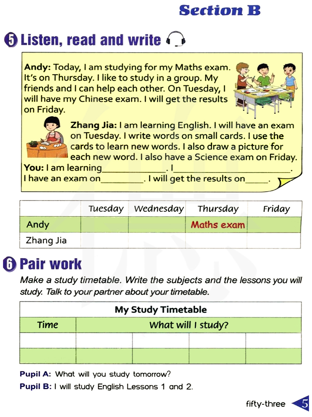 制作一张学习时间表。写下你将学习的科目与课程。向你的搭档讲述你的时间表