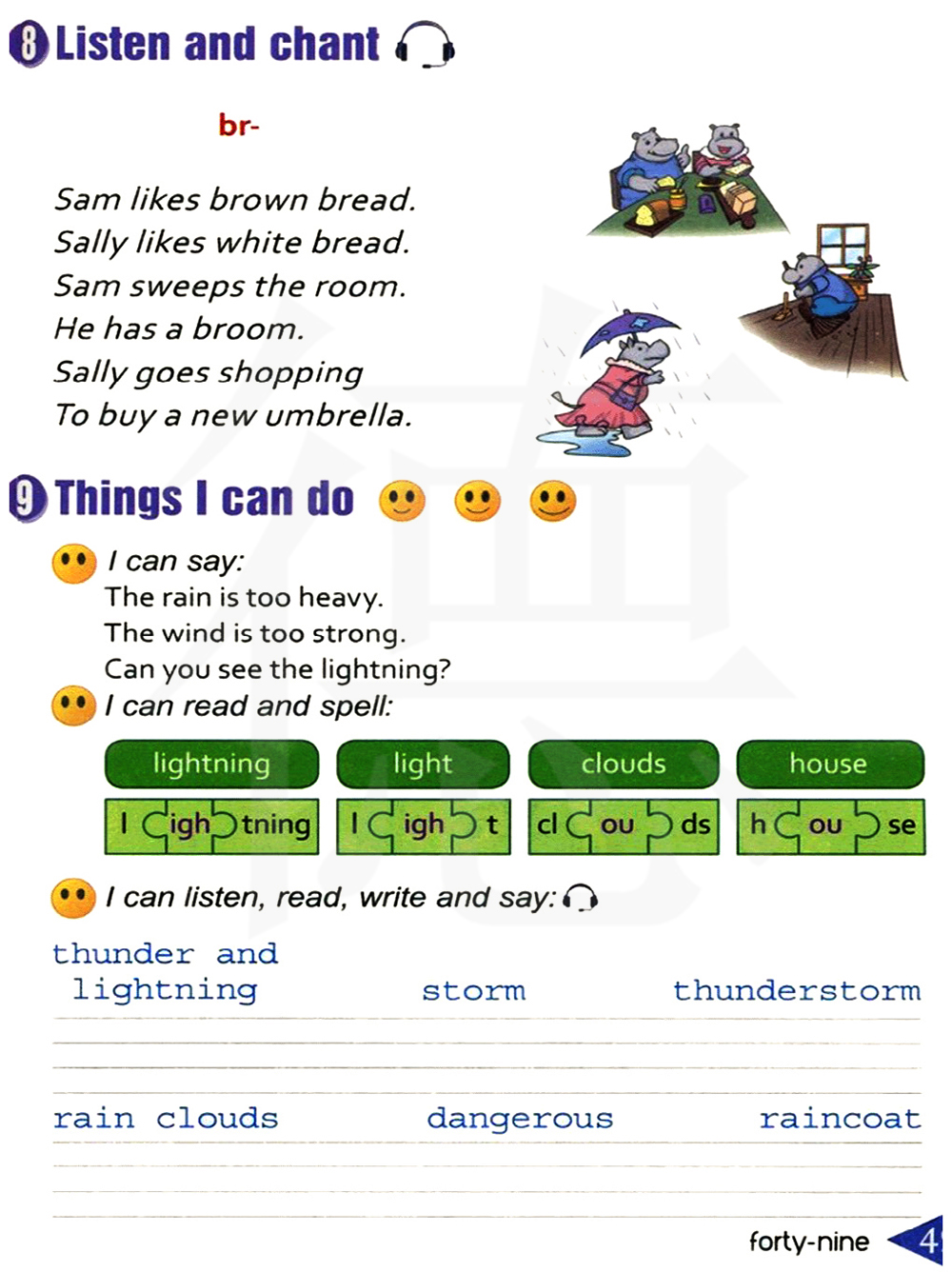 萨姆喜欢黑面包。 莎利喜欢白面包。 萨姆打扫房间。 他有一把扫帚。 莎利去购物,去买一把新雨伞。