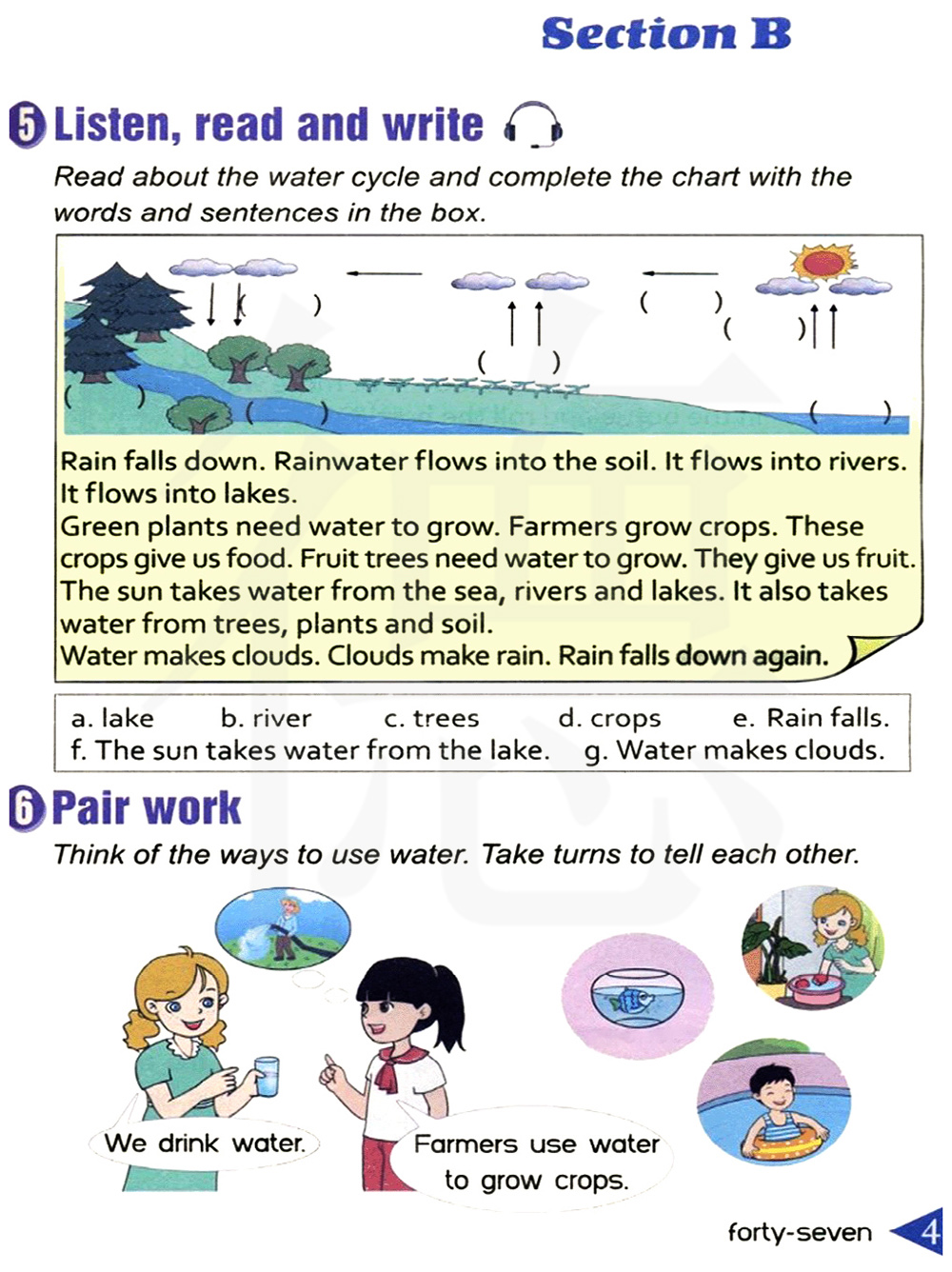 雨落下来。 雨水流入土壤。 它流入河流。 它流入湖里。绿色植物需要水来生长。 农民们种庄稼。 这些作物供给我们食物。 水果树需要水来生长。 它们供给我们水果。 太阳从海洋、河流和湖泊里带走水分。 它也会从树木、植物和土壤里带走水分。水分形成云。 云形成雨。 雨又再次落下来。