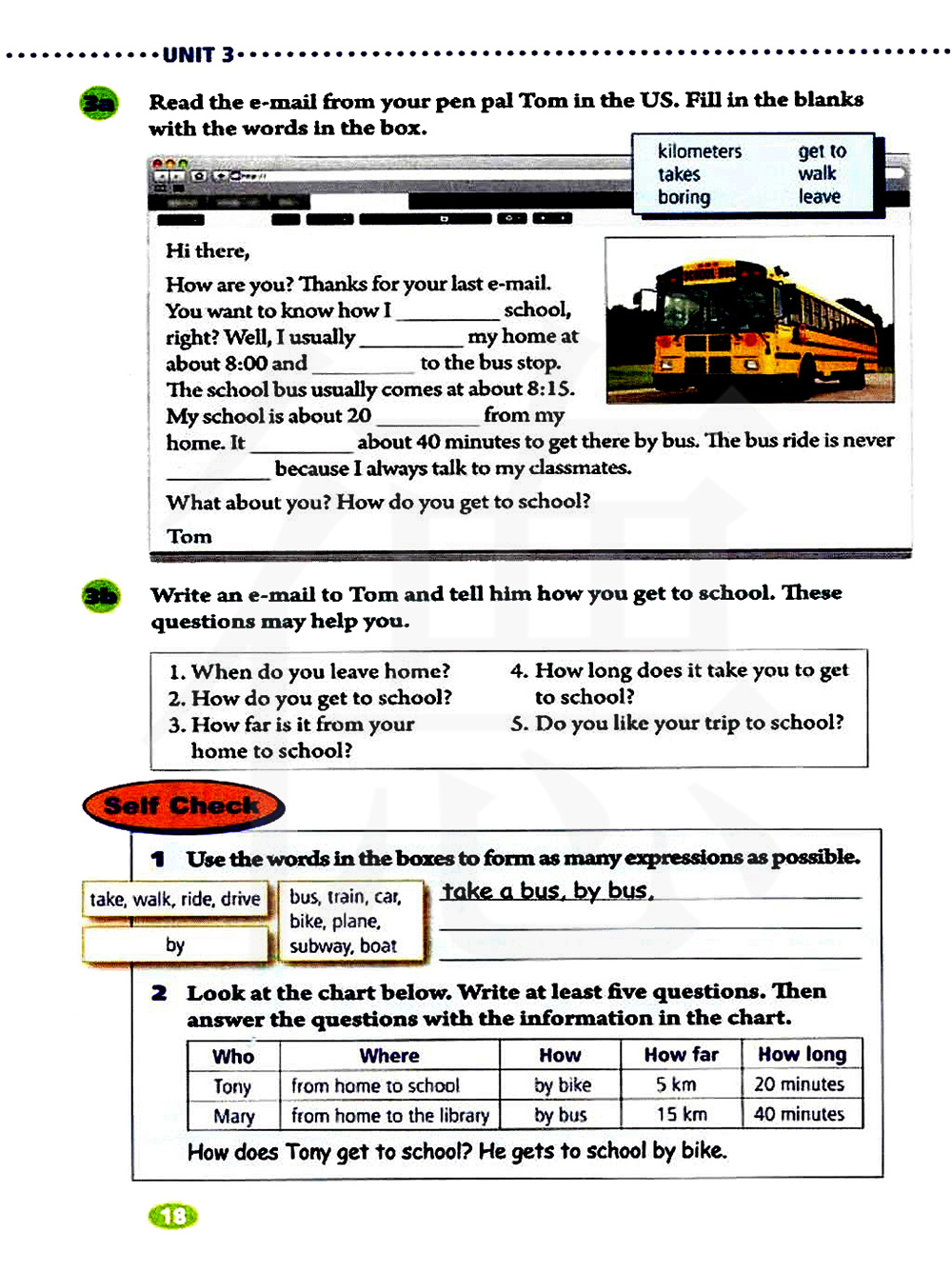 写一封电子邮件给汤姆,告诉他你怎样上学的。这些问题会对你有帮助。