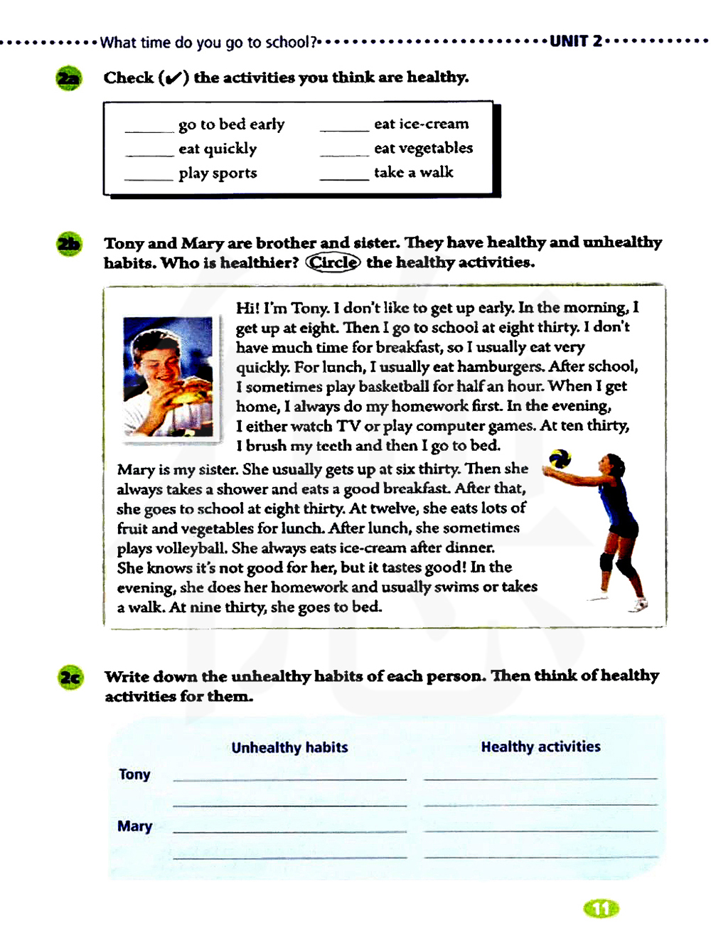 玛丽和托尼是姐弟。他们都有着健康和不健康的习惯。谁比较健康呢,圈出健康的活动。