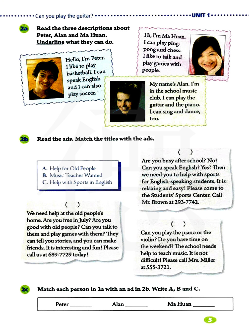 你好,我叫艾伦。我在学校的音乐俱乐部。我会弹吉他和钢琴,我也会唱歌和跳舞。