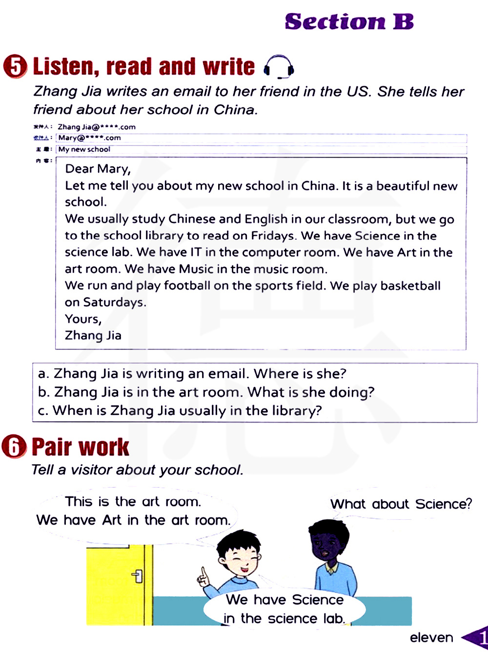 我们通常在教室里学习语文和英语,但是我们周五去学校图书馆看书。 我们在实验室里上科学课。在计算机室上计算机课。在美术室上美术课。在音乐教室里上音乐课。