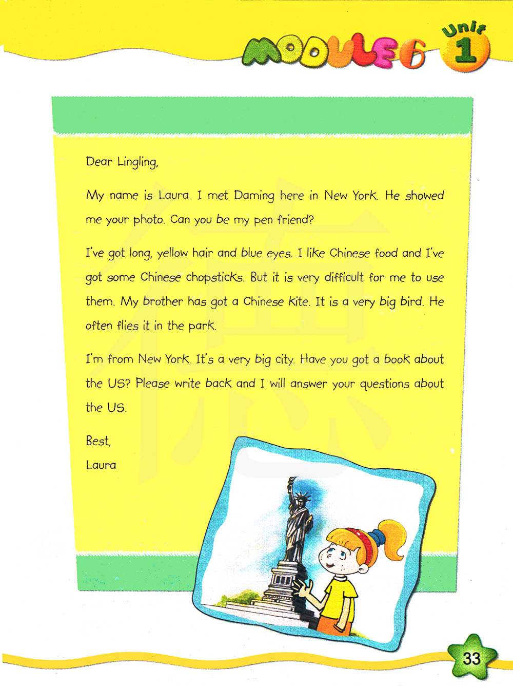 我叫劳拉。我在纽约见过大明。他给我看了你的照片。你可以做我的笔友吗?