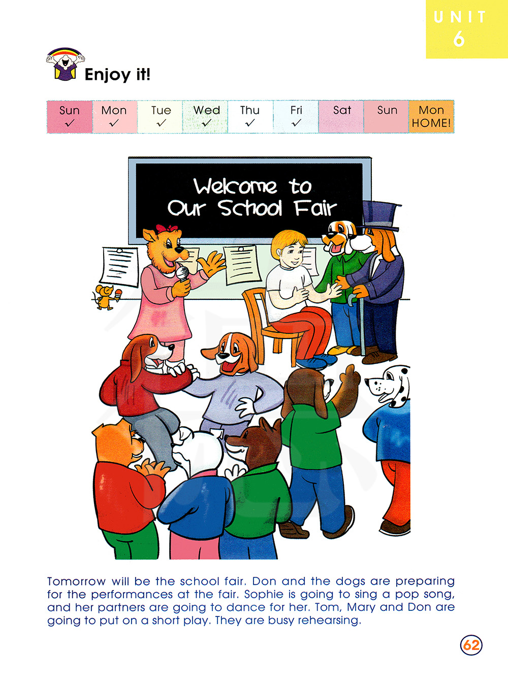 明天就是校园展览会了。唐和小狗们正在为展览会上的表演做准备。索菲打算唱一首流行歌曲,而她的搭档将为她伴舞。汤姆、玛丽和唐准备表演一个短剧。他们正忙着排练。