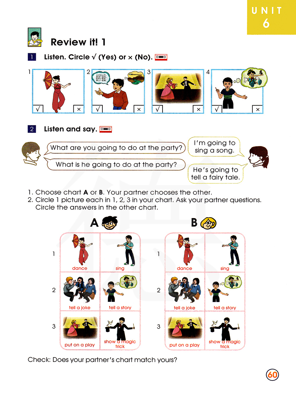 选择图表A或B。你的搭档选择另外一个。在你的图表里分别在1.2.3中圈出一张图片,向你的搭档提问,在另外一个图表里圈出答案。