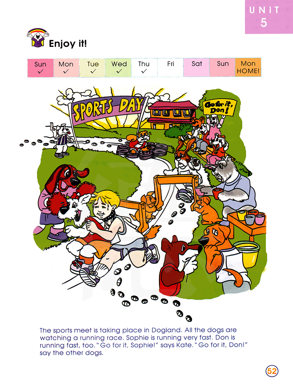 运动会正在狗岛上举行。所有的狗都在观看跑步比赛。索菲跑得飞快。唐也跑得很快。加油,索菲!凯特喊到。加油,唐!其他的狗喊到。