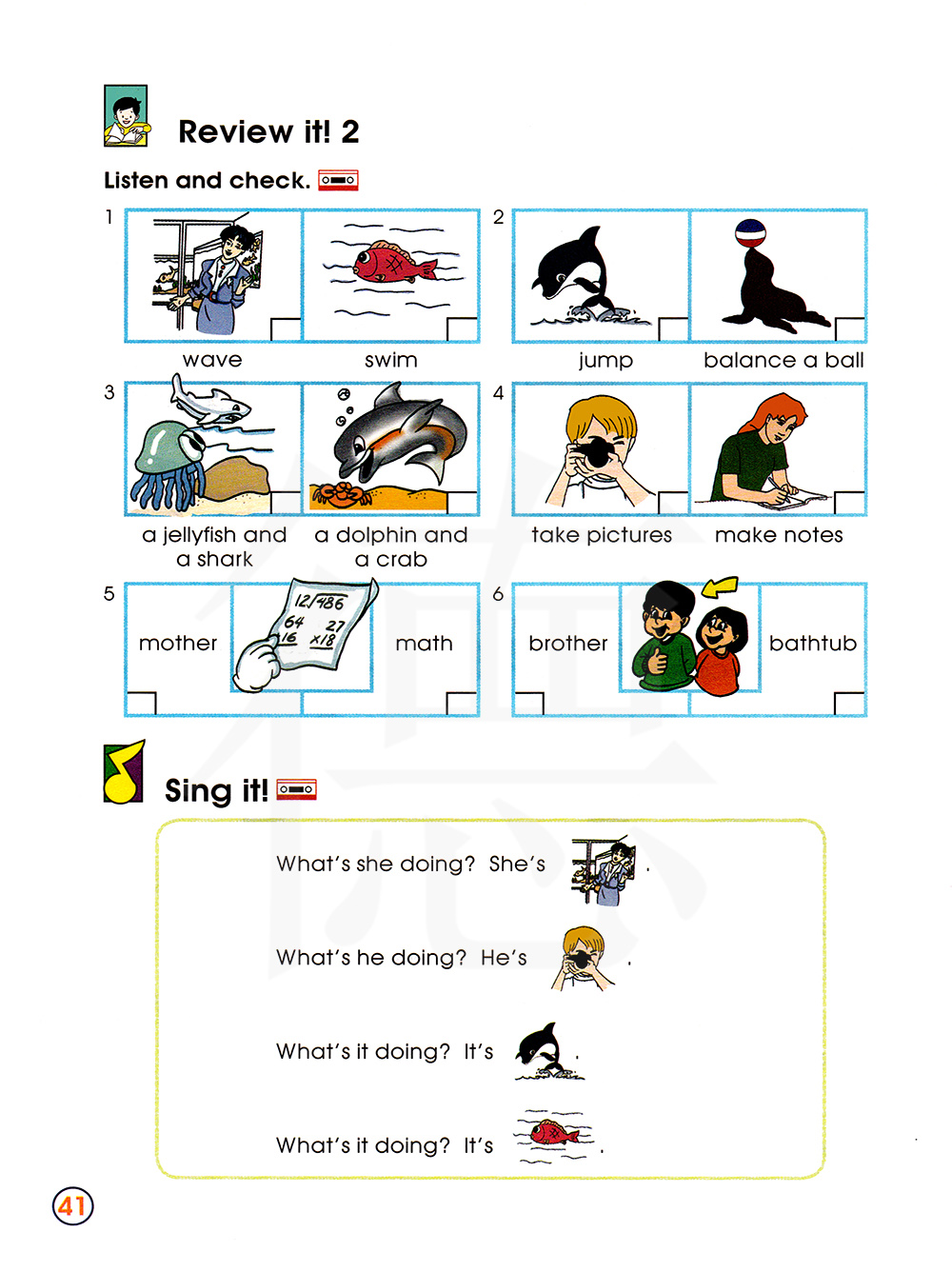 她正在做什么?她正在挥手。他正在做什么?他正在照相。它正在做什么?它正在跳。它正在做什么?它正在游泳。(歌曲)