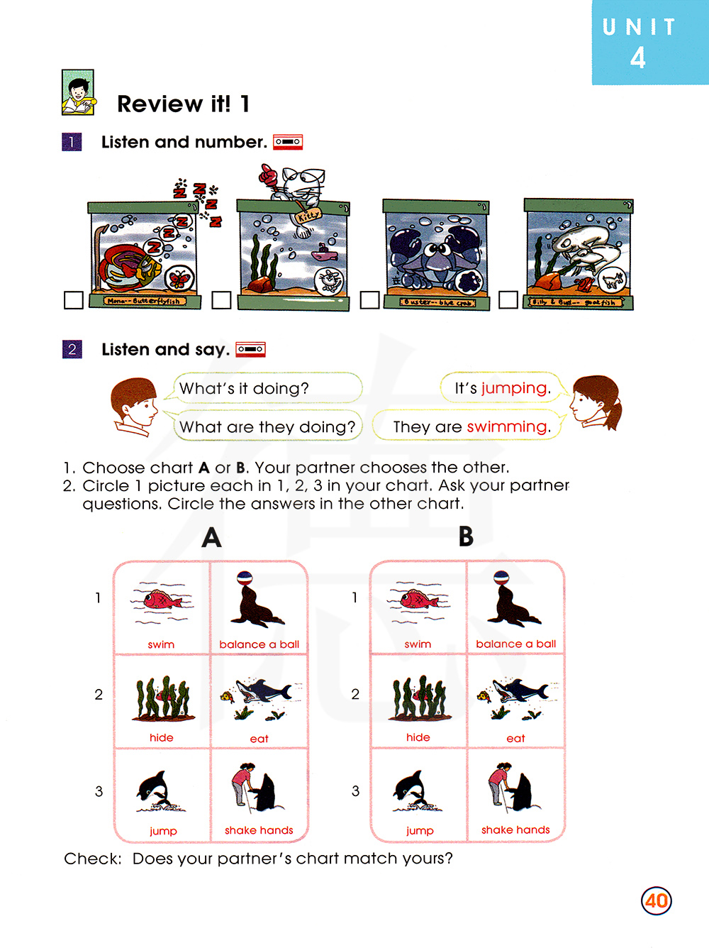 选择图标A或B,你的搭档选择另外一个。在你的图表里分别在1.2.3中圈出一张图片。向你的搭档提问,另外在你的另一个表里圈出来。